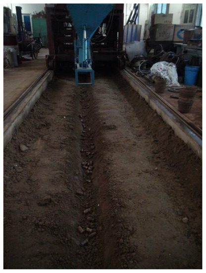 Based on the results of previous experiments [13], the factors of the seed-filling uniformity of the seed-metering device were the rotational speed of the rake bar chain (A), the angle of the rake bar chain (B), and the number of billets (C). For comparison, the same factors were used in this study. A furrow with a depth of 0.2 m and a length of 11 m was opened in the soil bin beforehand. The seeding port of the seed-metering device was directly above the furrow, and there was a small gap between the seeding flap and the furrow. The trolley system discharged billets into the furrow at a constant forward speed during the experiment (Figure 3).