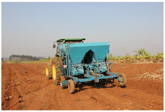 According to the influence of the above factors on the planting uniformity, the single-bud billet planter was designed with the angle of the rake bar chain set to 117°, and an adjustment plate was installed in the seed box to ensure that there were 500–800 billets in the effective working area of the rake bar chain. To further improve the qualified rate of filling, the planter adopted three rake bar chains in each seed box to increase the rate of seed filling. Considering that the high rotational speed of the rake bar chain may cause damage to the billets, the use of three bar chains per seed box could adapt to the fast-speed operation at a lower rotational speed. Meanwhile, a parabolic guide plate was designed at the seeding port to make the billets fall into the furrow more smoothly. The single-bud planter was equipped with two seed boxes, two openers, two fertilizing devices, two sett-covering devices, two film-covering devices, and other devices. The whole plant system was composed of a JOHN DEERE 1204 tractor (120 kW) and an HN 2CZD-2 single-bud sugarcane planter (Figure 4). Field experiments were carried out in the farm of Guangdong Guangken Agricultural Machinery Service Co., Ltd., in the city of Zhanjiang, Guangdong Province, China. The test field was latosol, deep-soil-layer, sticky heavy texture, poor fertility, acidic soil.