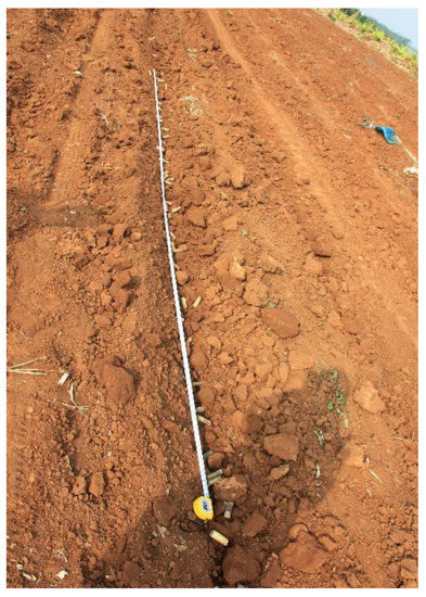According to the sugarcane planting requirements and the characteristics of single-bud billets, the number of billets in a unit length of 0.5 m was counted as shown in Figure 5. The indexes used to evaluate the field planting uniformity were the same as those used in the laboratory, i.e., the quality index Zq, multiple index Zm, and miss index Ze.