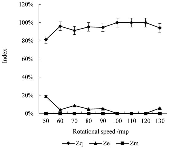 According to a univariate analysis of variance, at the 95% confidence interval, the rotational speed had a significant effect on the quality index Zq (F = 2.508, p = 0.048 < 0.05) and miss index Ze (F = 2.508, p = 0.048 < 0.05). In the previous experiment [13], rotational speed had no significant effect on the uniformity of seed filling, indicating that the forward speed may promote the influence of the rotational speed on the planting uniformity. Reference [23] also mentioned the influence of forward speed on planting. The specific trends can be seen in Figure 6: when the rotational speed increased from 50 rpm to 130 rpm, the value of the quality index Zq changed little and remained above 80%; the value of the multiple index Zm was always zero; the value of the miss index Ze first decreased with the increase in rotational speed, and then was almost zero when the rotational speed was between 100 rpm and 120 rpm. Yazgi et al. [24] also found that the qualification rate of the seeding unit increased first and then decreased with the increasing sprocket speed. The value of the miss index Ze then increased slightly when the rotational speed reached 130 rpm. That indicated that increasing the rotational speed could increase the probability of acquiring billets in the rake bar and thus improve the planting uniformity, but when the rotational speed is too high, the probability decreases, and the bud may be damaged. Therefore, the rotational speed should be as low as possible when meeting planting requirements.