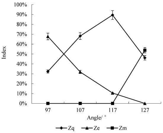 According to the univariate analysis of variance, at the 95% confidence interval, the angle of the rake bar chain had a significant effect on the quality index Zq (F = 20.477, p = 0.001 < 0.05), the multiple index Zm (F = 50.281, p = 0.001 < 0.05), and the miss index Ze (F = 49.629, p = 0.001<0.05), which is consistent with the results of the previous seed-filling uniformity experiment [13], and the other sugarcane billet planter had the same trend [9]. As shown in Figure 7, with the increase in the angle of the rake bar chain, the quality index Zq first increased and then decreased. When the angle was 117°, the quality index Zq reached the maximum of 89.47%. When the angle continued to increase to 127°, the quality index Zq decreased and the multiple index Zm increased significantly to 53.85%, while the miss index Ze decreased to zero. It is evident that the increase in angle makes more billets enter the working area of rake bar chain, which was beneficial to improve the planting uniformity. However, if the angle was too inclined, too many billets would be taken out, resulting in the increase in the multiple index Zm; as such, the optimal angle was 117°.