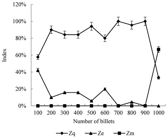 where is the number of units in which the number of billets is more than 0.5 times and less than 1.5 times the theoretical number of billets; is the number of units where the number of billets is more than 1.5 times the theoretical number of billets; is the number of units where the number of billets is less than 0.5 times the theoretical number of billets; N is the total number of units; is the standard deviation of the number of billets per unit; and is the average number of billets in all units.