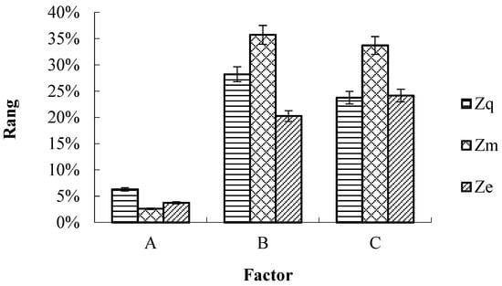 According to the value of Eta2 in Table 6 and Figure 9, the greater the value of Eta2, the greater influence of the factor. The order of factors affecting the quality index Zq and multiple index Zm was B×C > B > C > A, and the order of factors affecting the miss index Ze was C > B > B×C > A.