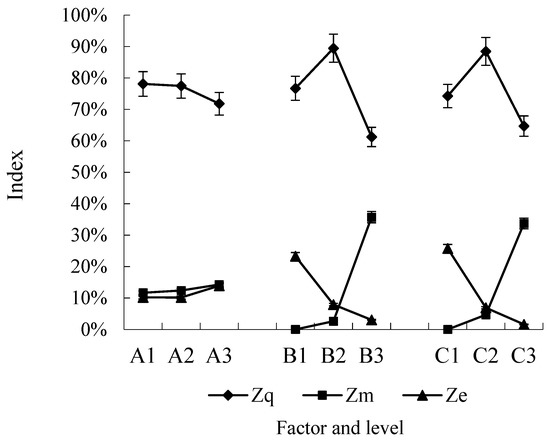 - According to the three indexes, the optimal combination was A1B2C2. Under this combination, the quality index Zq was 97.22% and the multiple index Zm was 0%, while the miss index Ze was 2.78%.