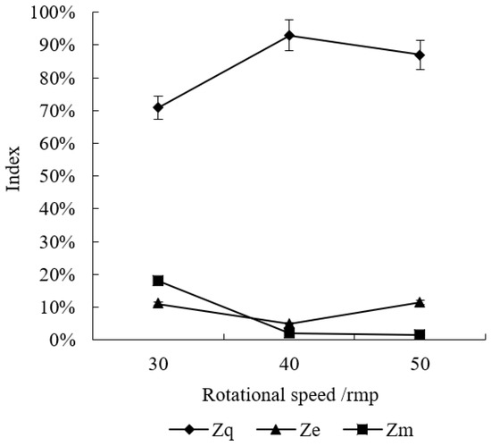 General linear models variance analysis was conducted on the orthogonal test results, and the results are listed in Table 6. Factor A had no significant effect on the quality index Zq (p = 0.642 > 0.05), multiple index Zm (p = 0.556 > 0.05), or miss index Ze (p = 0.83 > 0.05), which is consistent with the single-factor test results in 3.1.1.