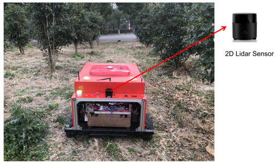 In this research, a differential test platform with a maximum speed of 1 m/s was built, as shown in Figure 1. The LiDAR sensor scans the surrounding data in real time, and the obtained LiDAR sensor data are transmitted to the industrial computer. The industrial computer runs a self-made software system to analyze the LiDAR sensor data. The LiDAR sensor is Rashen N30103B and it adopts the horizontal installation method, which is located in the front and middle of the orchard transportation robot. The installation height is 0.65 m and the parameters are shown in Table 1.