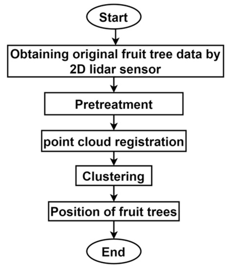In this section, we introduce the complete method of fruit tree information perception; the specific process is shown in Figure 2. When the test platform runs in the orchard, the surrounding fruit tree information can be obtained by 2D LiDAR sensor scanning, and the point cloud data of the fruit tree will be preprocessed. Preprocessing is used so as to only retain fruit trees on both sides of the test platform for point cloud registration and clustering. The most important is point cloud registration and clustering. Firstly, complete fruit tree data on both sides can be obtained by point cloud registration. Then, the position of each fruit tree can be obtained by a clustering algorithm.