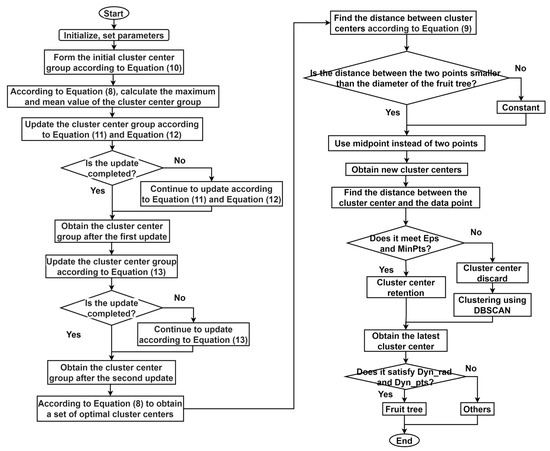 14. According to the final cluster center (cfinal), the following two conditions need to be met to determine whether something is a fruit tree. Firstly, if the fruit tree dynamic radius (), which is , is satisfied, an object is a fruit tree. At the same time, if it meets the dynamic neighborhood density threshold (), the object is a fruit tree.