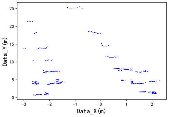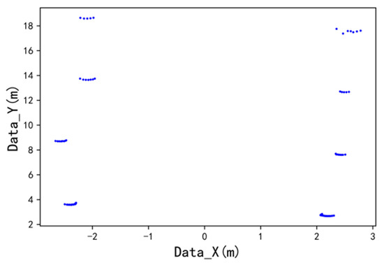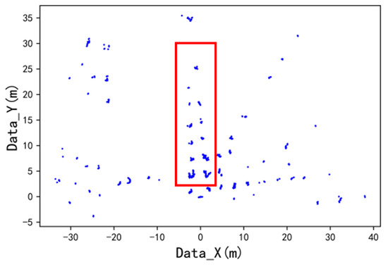 Firstly, the test platform is controlled to drive slowly from the beginning of the fruit tree to the end of the fruit tree to collect the point cloud data of the fruit trees. Then, all the initial point cloud data of the fruit trees are preprocessed, and the final result only retains the nearest point cloud data of the fruit tree on both sides of the test platform. The original point cloud data, as shown in Figure 5, show that the data in the untreated orchard have many interference points, such as the data collected from non-bilateral fruit trees and the “zero-points” generated by the 2D LiDAR sensor at a certain angle. During the preprocessing, we keep the data in the red box in Figure 5. The preprocessed data are shown in Figure 6.