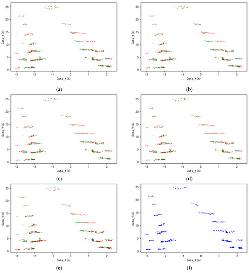The 2D-ICP algorithm registration process. (a) First point cloud registration; (b) second point cloud registration; (c) third point cloud registration; (d) fourth point cloud registration; (e) last point cloud registration; (f) results after two-frame point cloud alignment.