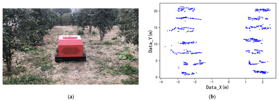 Complete fruit tree row point cloud data. (a) Fruit trees on both sides of the test platform in the actual scene; (b) point cloud data corresponding to fruit trees on both sides of the test platform.