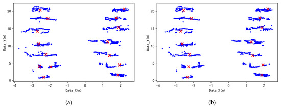 The implementation process based on the LAPO-DBSCAN algorithm is as follows. According to the LAPO-DBSCAN algorithm, a set of clustering centers are obtained from step (3) to step (8). In three situations of the missing detection of some fruit trees, two clustering centers appear on one fruit tree and the clustering center obviously deviates from the fruit tree data. Here, we take two clustering centers together as examples, as shown in Figure 9a. Then, we obtain the complete cluster center through step (9) to step (13). Finally, the test results of fruit trees are obtained through step (14), as shown in Figure 9b, where the blue point is the data point and the red “×” is the clustering center. The corresponding cluster center coordinates are shown in Table 4. According to Figure 8b and Table 4, this algorithm can accurately detect the position of fruit trees.