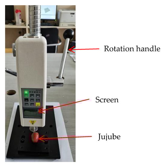 The single-fruit weight was obtained by dividing the sample weight by the number of jujubes contained in the sample. The whole-fruit puncture test was used to determine the hardness of jujube samples collected from girdled and non-girdled trees. In the experiment, 30 fruits were taken from each sample for hardness measurement, and the average value of the 30 fruits’ hardness was taken as the final value for this sample. The measuring instrument was GY-4 digital display hardness tester produced by Leqing Aidebao Instrument Co., Ltd. (Leqing, China) with a resolution of 0.01 kgf/cm2. The diameter of puncture head was 2 mm and the puncture depth was 3 mm. During the measurement, the jujube fruit was fixed, the lifting handle was manually rotated at a uniform speed until the probe of the durometer pierced about 3 mm below the peel and then the data were recorded. The hardness-measuring part was near the equator of the fruit. Then, each jujube fruit was measured 4 times around the equator in total, and their average value was taken as the final result of this jujube. The hardness-test method of jujube is shown in Figure 2, and the hardness value is calculated by Equation (1).