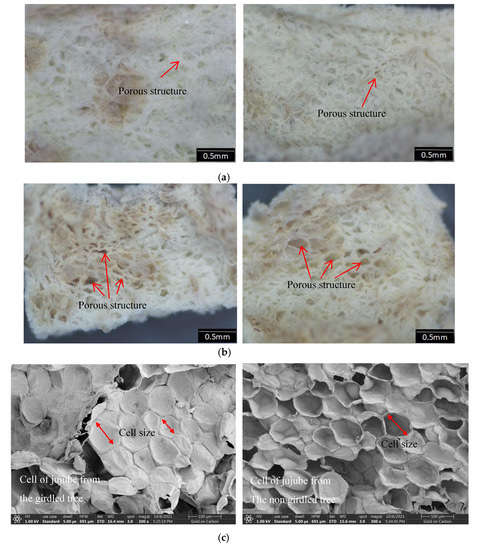 Microscopic-observation results of the internal structure of jujube fruit: (a) the micrograph of jujube fruit from non-girdled trees; (b) the micrograph of jujube fruit from girdled trees; (c) the microstructure of jujube fruit from the girdled and non-girdled trees in scanning-electron-microscope images.