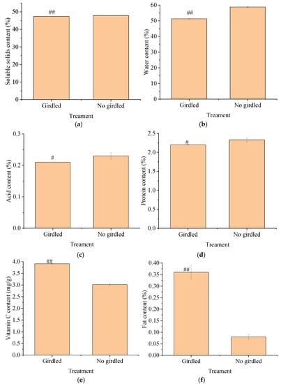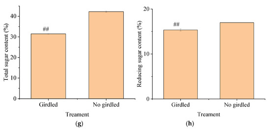 The test results of the content of nutrients in jujube fruit from non-girdled jujube trees and girdled ones are shown in Figure 4. In addition, we made a significance analysis on the content differences of every same nutrient in jujube from girdled jujube trees and non-girdled ones; the results were marked in Figure 4. The conclusions were obtained from Figure 4a,b that the soluble solids and water content of jujube fruit from non-girdled jujube trees were higher than those of girdled ones, with highly significant differences. The conclusion was drawn from Figure 4c,d that the total acid and protein content of jujube fruit from non-girdled jujube trees were higher than those of girdled ones, with significant differences. However, from Figure 4e,f, the information acquired was that the vitamin C and fat content from non-girdled jujube trees were lower than those of girdled ones, with highly significant differences. Furthermore, from Figure 4g,h, it was found that total sugar and reducing sugar content from non-girdled jujube trees were both higher than those of girdled ones, with highly significant differences.
