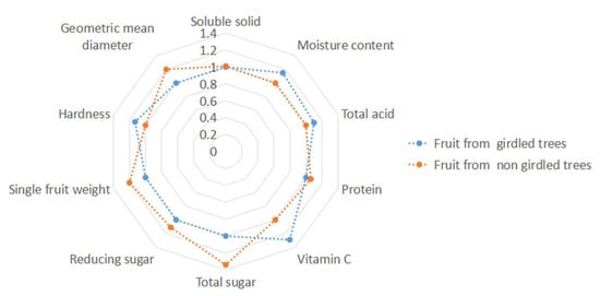 Some jujube fruit quality indicators are positive ones (i.e., the larger the better), while some are negative ones (i.e., the smaller the better), so we cannot directly conduct comprehensive evaluation on these indicators. Therefore, for the convenience of analysis, all the indexes of internal quality of jujube were normalized, and their dimension was unified as “1”. Thus, all positive indicators were processed in this way: the larger value of each index measured corresponding to the girdled jujube fruit, and non-girdled jujube fruit was divided by the smaller value; then, the larger index data were replaced with this ratio, while the smaller were replaced with “1”. The treatment method of inverse index (such as total acid, moisture content, etc.) was opposite to that of positive index. After the experimental data were processed in this way, it was ensured that the larger the indexes in the radar map, the better; and the larger the area surrounded by the index values of the girdled jujube fruit or the non-girdled jujube fruit, the better the quality of the corresponding jujube.