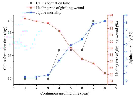 Through years of investigation and statistics on the healing condition of the girdling wounds, the results showed that long-term continuous girdling led to a significant decline in the healing speed and quality of the wounds caused by girdling. In addition, the statistics of the relationship between the time required for the healing of the girdling wounds, the complete healing rate of wounds, the mortality of jujube trees and the long-term continuous girdling time are shown in Figure 6.