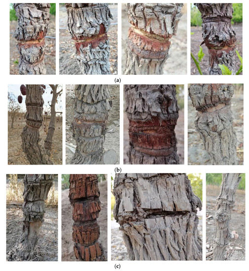 Fruit farmers in Southern Xinjiang generally choose to girdle the trunk of jujube trees, because this girdling scheme has more advantages for them. First of all, trunk girdling has an obvious effect on increasing production and income, which can usually increase production by 30~50% compared with jujube trees without girdling (according to the statistics of fruit farmers), and the labor cost is also significantly reduced compared with branch girdling. Secondly, according to our investigation and the statement of fruit farmers, a large number of tender phloem is exposed after the girdling of branches, which is easy to cause insects to bite the phloem or lay eggs on the wounds caused by girdling, causing adverse effects on the health of jujube trees. However, after trunk girdling, there is only one girdling wound, and the phloem on the wound has low moisture content and high hardness, so it is not easy to cause the above problems. Therefore, jujube farmers in southern Xinjiang generally choose trunk girdling. In order to increase jujube yield and fruit producers’ income, fruit farmers often girdle jujube trees every year [16].