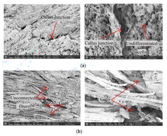 SEM images of callus and new phloem from girdling wounds: (a) SEM images of callus from girdling wounds after 45 days; (b) SEM images of phloem from girdling wounds after 150 days.