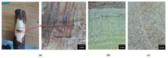 In addition, jujube girdling also caused damage to the xylem. Through the observation of the xylem from the girdling wounds, it was found that there were obvious wounds on the surface of the xylem at some xylem samples, and the color of the xylem became black, as shown in Figure 9a. Furthermore, through the observation of the cross-sectional microscope images of the xylem from the trunk of girdled and non-girdled jujube trees, it was found that the cross-sectional color of the trunk from non-girdled jujube trees was light green (as shown in Figure 9b), but the color of the trunk from some girdled jujube trees turned gray (as shown in Figure 9c).