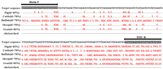 Specificity analysis of target sequence (transgenic goats) and location of the RPA primers. BLAST and ClustalW results of target sequence (transgenic goats) with genomic sequences of other species (non-transgenic): pigs (85%), cattle (78%), buffalos (78%), sheep (78%), goats (80%), chickens, and ducks (0%). Biotin-F: forward primer, FITC-R: reverse primer.