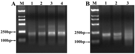 Optimized conditions of RPA: (A) Optimization of the concentration of primers. Lane M represents Marker 2000. Lanes 1–4 represent 0.1 µmol/L, 0.15 µmol/L, 0.2 µmol/L, and 0.25 µmol/L, respectively. (B) Optimization of the reaction temperature. Lane M represents Marker 2000. Lanes 1–3 represent 42 °C, 40 °C, and 38 °C, respectively.