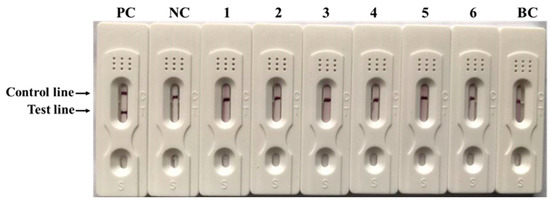 The specificity of primers plays critical role in the detection of genetically modified animals. To assess the specificity of the established RPA-LFD method, the genomic DNAs extracted from seven non-transgenic animals, namely, goats, pigs, cattle, buffalos, sheep, chickens, and ducks, were tested using RPA-LFD as shown in Figure 3. Consistent with the expected results, LFB only showed a positive signal in the positive control (PC) samples of the transgenic goats, and a control line and a test line were simultaneously observed in the detection zone. Moreover, the other non-transgenic samples only showed a control line, with no color in the test line. These results indicate that the RPA-LFD assay can successfully distinguish its target DNA from that of non-transgenic animals without cross-reaction or false positive signals were observed, and that the HSA transgenic RPA-LFD assay is specific for the detection of its corresponding target.