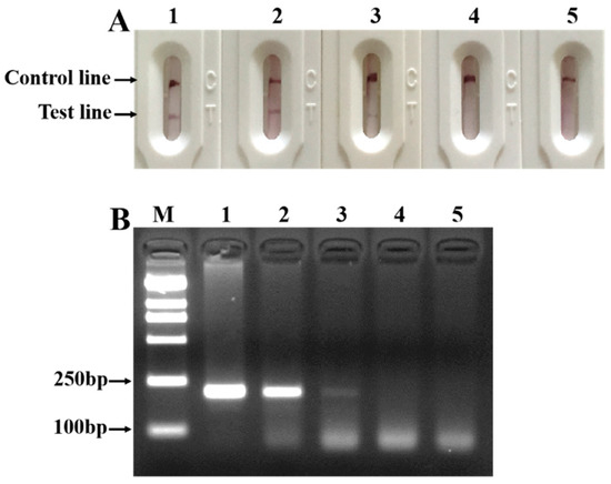 Comparison of the sensitivity of RPA-LFD and conventional PCR: (A) sensitivity of RPA-LFD, (B) sensitivity of conventional PCR. M, Marker 2000; lines 1–5 represent 50 ng, 10 ng, 0.1 ng, 0.01 ng, and blank control, respectively.