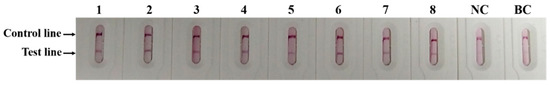 Finally, to test the efficiency of the RPA-LFD assay screening of genetically modified samples, the DNAs of nine animals (transgenic goats and non-transgenic goats) were selected as templates to validate the reliability of RPA-LFD. All samples were tested according to the optimized RPA-LFD assay reaction system, and the result can be observed in Figure 5. According to the results, the test line was present in eight transgenic samples. However, the test line was not observed in the negative and blank controls, and the LFD worked normally. The RPA-LFD test results are consistent with the information provided by the sample developer.