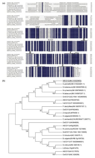 The homologous amino acids sequence alignment and phylogenetic tree analysis of SlEGY2. (a) Multiple sequences alignment of SlEGY2 with other homologous proteins in other species. Three conserved motifs (HEXXH, GNLR, and NPDG) in metalloproteases are remarked in black framers. Six predicted transmembrane topologies (A–E) are marked in black lines. Transmembrane topology is predicted by ExPASy (http://web.expasy.org/protscale/, accessed on 6 October 2018). (b) Phylogeny analysis of SlEGY2. Phylogeny was generated by using the Neighbor Joining (NJ) method of MEGA. Bootstrap analyses were obtained with 1000 replicates and the percentage values over 50 were brought out. The accession numbers of proteins are shown in parentheses.