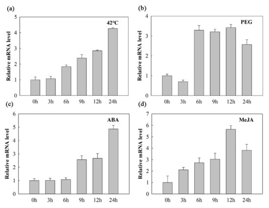 To analyze the expression pattern of SlEGY2 under different abiotic stress treatments, quantitative RT-PCR was performed. The SlEGY2 gene showed various expression pattern in different conditions (Figure 3). Under 42 °C and PEG treatment, SlEGY2 was induced and the transcripts accumulated to approximately four-fold than that of the control (Figure 3a,b). The SlEGY2 expression was also obviously increased under ABA and MeJA treatments. The mRNA accumulation of SlEGY2 reached five times at 24 h with ABA and six times at 12 h with MeJA treatment (Figure 3c,d), respectively. These results could speculate that SlEGY2 may participate in the abiotic stress response, especially in heat stress.