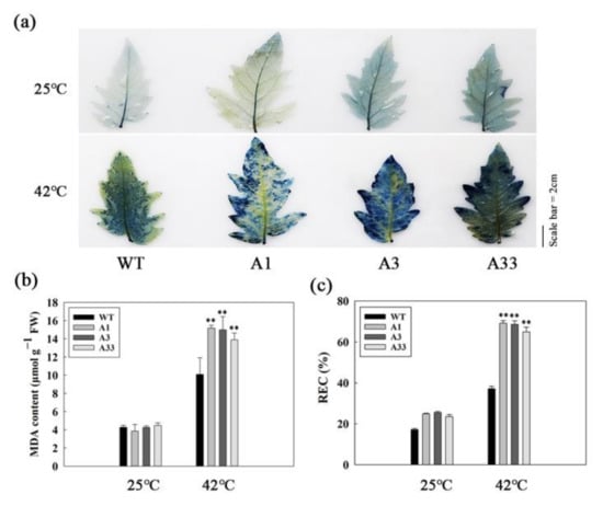 The data in this study were presented as the average of three replications. Statistical analysis was tested by using SigmaPlot 12.5. * (p < 0.05) and ** (p < 0.01) indicate significant differences between the WT and transgenic tomato plant.