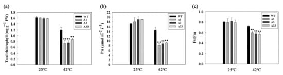Content of chlorophyll (a), Pn (b), and Fv/Fm (c) in WT and AS lines. ** (p < 0.01) indicate significant differences relative to the WT plants.
