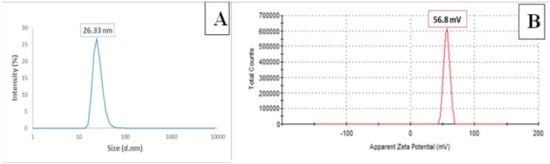 DLS was used to measure hydrodynamic diameter in the nanometer range. The size of the chitosan–urea nanocomposite was 26.33 nm, with a zeta potential of 56.8 mV (Figure 2).