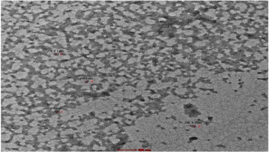 A transmission electron microscope (TEM) gave us information on the particle shape and the determination of particle size. A typical TEM micrograph of the CS–urea NH is shown in Figure 3. CS–urea NH has a nearly spherical shape, smooth surface, and an average size of 26.2 nm.