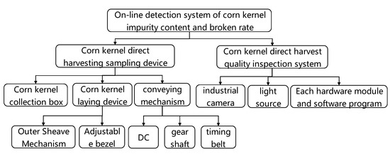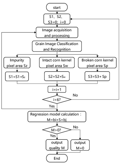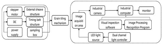 Figure 3 shows a flowchart of the operation of the system. Materials (i.e., complete corn kernels, broken kernels, impurities, etc.) enter the discrete tile sampling device from the feeding inlet above the sheaf and the stepper motor drives the sheaf to rotate in order to realize the controllable feeding of the harvested corn kernels. The sheaf slides under the blocking of the sliding plates on both sides such that the material falls into the conveyor belt evenly and gently and this prevents splashing and accumulation under the synchronous belt. The motor drives the conveyor belt and the adjustable baffle structure controls the single-layer passage of the material in order to prevent stacking. The material passes through the continuous-tiling sampling mechanism in order to realize the required single-layer discrete tiling and it then enters the image acquisition area. The camera is then used to collect the sample image under the double-LED supplementary light. The image information is transmitted to the industrial computer for image processing in order to realize the classification and identification of the complete grains, impurities, and broken grains that are present in the image. Then, the impurity content and breakage rates of the collected images are calculated and the results are displayed on the output interface in real time.