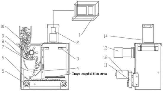 Considerable effort has been invested into research on technology that can be used to perform the online detection of impurities in grain-crushing. Chen [3] et al. designed a grain flow collection device that can be used to reduce the adhesion and stacking of the grains during detection and set the appropriate RGB color and area feature thresholds in order to realize the online identification of impurities and broken grains. Their test results showed that the comprehensive evaluation indices of broken grains, rice stalk impurities, and rice stalk impurities reached 92.92%, 90.65% and 90.52%, respectively. Shaozhong [4] et al. used an optimized watershed segmentation method in order to segment the adhering grains and they performed online identification of the unhulled, whole, and broken buckwheat, using a backpropagation (BP) neural network, which took 4.79 s to process and identify an image. Yang [5] et al. studied the discrete sampling of corn kernels by controlling the gap between two baffles and verified the discrete effect of the sampling device through a simulated experimental platform test. Chen [6] et al. used the intermittent sampling of rice grains and used a decision tree algorithm in order to identify grain impurities and they obtained an accuracy of 76% in their impurity identification. Momin [7] et al. used an HIS color model to segment an image, obtained the area and roundness feature combinations of the objects that were to be examined through image preprocessing, and thus detected the quality of soybean harvests. Their results showed identification accuracies for split beans, contaminated beans, and defective beans and stems/pods of 96%, 75%, and 98%, respectively. However, the existing intermittent or simple slippery discrete sampling methods do not completely solve the problems of material stacking and occlusion due to random and uncontrollable sampling amounts, which affects the detection accuracy and increases the difficulty that is encountered in the use of image recognition algorithms. Therefore, the development of methods that may be used to solve the material bonding, accumulation, and occlusion that occur during material sampling and optimize image recognition algorithms may be considered as effective measures to improve the efficiency and accuracy of crushed grain and impurity identification.