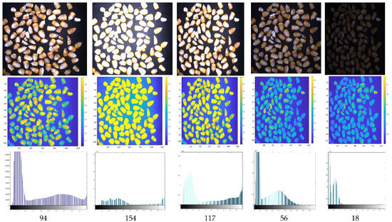 Then, the working parameters of the industrial camera are set and the brightness of the LED lights is controlled and adjusted. Five sets of grain images were collected and grayscale image processing was performed on them. A graph of this process that was used for the analysis is shown below. Figure 4 shows the information of harvested corn grains under different brightness conditions.