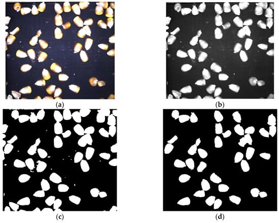 An industrial camera was used to acquire an image of a single layer of the material, as shown in Figure 5a, and the image preprocessing was performed [14]. After the image’s grayscale processing, an arithmetical mean filter was used to perform a smoothing and opening operation in order to remove the noise information in the picture, as shown in Figure 5b. The Otsu threshold segmentation process was performed in order to obtain a binary image, as shown in Figure 5c. The optimized watershed segmentation algorithm was used to segment the stuck corn kernels. By reconstructing the gray image and obtaining the image’s gray gradient as the segmentation function, the minimum correction gradient magnitude image was imposed between the background and the object and the initial segmentation of the grains’ adhesion was realized based on the watershed segmentation algorithm. The R + G color of the original image was extracted in order to construct the grayscale gradient, mark the image’s background, and select the still-adhered grains for watershed segmentation. The segmented grain image was subjected to boundary suppression and a filling processing in order to prevent the edge grains from being misidentified due to the cropping and processing of the internal details of the grain that generate holes. Then, any small interfering closed areas were removed in order to obtain a complete segmentation image, as shown in Figure 5d.