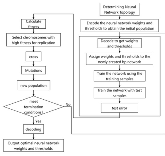 In order to classify the corn kernels’ integrity, the proposed approach uses the GaBP neural network [18] to realize the identification of broken kernels. Using the Levenberg–Marquardt (BpLM algorithm) training model [19], this structure has the advantage of faster computational speed. A 4-layer BP neural network structure was constructed and the weights and thresholds of the BP neural network were iteratively optimized by the use of a genetic algorithm in order to reduce the error of the network training that can be caused by the randomness of the parameters and to avoid falling into local optima. The basic steps of the optimization of the genetic algorithm are shown in Figure 6.