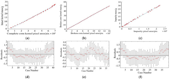 Linear regression analysis of pixel area and mass. (a) Relationship between the quality of the whole corn kernel and the pixel area, (b) relationship between broken corn kernel quality and pixel area (c) relationship between impurity quality and pixel area, (d) residual analysis of intact corn mass and pixel area, (e) residual analysis of broken corn quality and pixel area, and (f) residual analysis of impurity mass and pixel area.