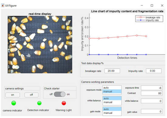 We adjusted the baffle’s clearance in order to obtain the best working condition for the monitoring device. We then continuously collected materials, adjusted the working brightness of the LED, and performed image acquisition and identification. The image acquisition and identification test is shown in Figure 9 and the display interface of the monitoring system is shown in Figure 10. In the proposed system, accurate grain segmentation was achieved by the image preprocessing of the collected material images and the identification of impurities and broken grains was achieved by the application of a feature threshold combination and the GABP neural network. The recognition accuracy was calculated for every three consecutive images in order to ensure the reliability of the evaluation and three sets of recognition results were collected for analysis. Figure 11 shows the image processing and recognition results of the harvested corn grains. The proposed approach first obtains the segmentation map of the harvested corn grain image and it then performs boundary suppression processing, as shown in Figure 11b. Through the step-by-step classification and identification of impurities and broken kernels and their labeling and counting, respectively, the classification and labeling results were plotted, as shown in Figure 11c.