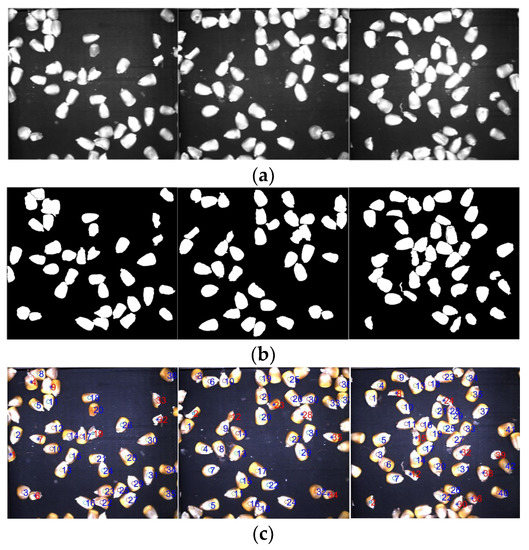 Image processing and labeling of harvested corn grains. (a) Grayscale image of harvested corn grains. (b) Boundary suppression binary map. (c) Corn grain harvest image marker.