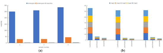 The proposed approach uses the continuous collection of grain images to accumulate and calculate the impurity content and breakage rate. The number of grains that are present in a single image affects the cumulative weighting of the data for the images. In future research, we plan to adjust the structure of the device in order to increase the image collection field of view and increase the number of single images that are collected. We also intend to improve the computational performance of the image processing methods and the calculation efficiency of the system’s impurity fragmentation rate.