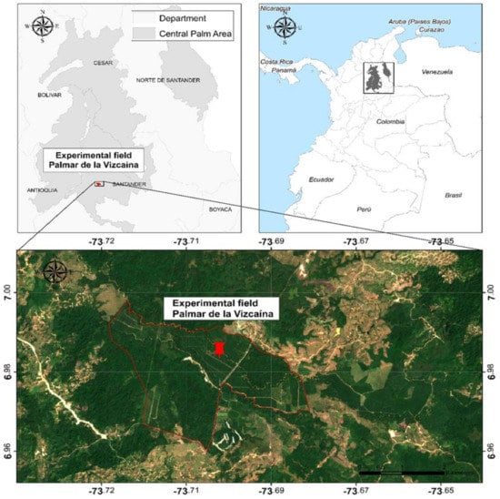 The project was conducted in the central oil palm region of Colombia, where Palmar de la Vizcaína Experimental Station (CEPV) is located (centered on the WGS84 geographic coordinates of: 6°59′13″ N, 73°40′62″ W). This station is managed by the Centro de Investigación en Palma de aceite—Cenipalma, located in the municipality of Barrancabermeja, Santander, Colombia (Figure 1).