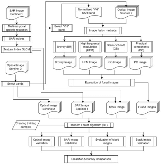 It is possible to find several research studies referring to the common use of different sources of satellite data, both optical and SAR, since the information acquired by both sources is complementary [2] and allows for an increase in the accuracy of the classification of different land covers through the implementation of supervised classification methods such as the random forest (RF) algorithm. These studies have been implemented in other applications, such as in the improvement of cartography focused on the mapping of large-scale crops [42,61], in improved water body visualization using optical and SAR image fusion techniques [19], and in applications oriented to oil palm crop mapping [14], among others.