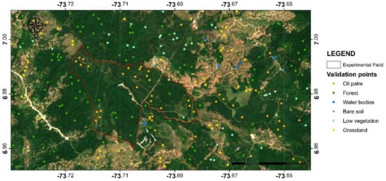 Currently, oil palm crops in Colombia are distributed throughout four palm zones, where the central palm zone is the largest, corresponding to 48% of the total area planted in the country [48]. The study area is a rural zone with a predominance of forest cover, oil palm crops, pastures, low vegetation, bare soils, and water bodies. It is characterized as a tropical zone with an average altitude above sea level of 90 m, a mean annual temperature of 27 °C, mean annual precipitation of 1600 mm, relative humidity above 80%, and shallow slopes less than 10%.