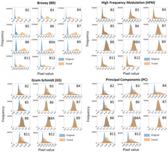 Histogram by bands of the pixel values of the images fused by the different methods evaluated vs. Sentinel-2 optical image. Values in orange correspond to the fused image; values in blue correspond to the Sentinel-2 optical image.