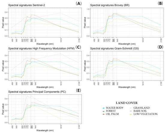 Spectral signatures of coverages identified on the Sentinel-2 optical image (A) and the images fused by the Brovey (BR) (B), high-frequency modulation (HFM) (C), Gram–Schmidt (GS) (D), and principal components (PC) (E) methods.
