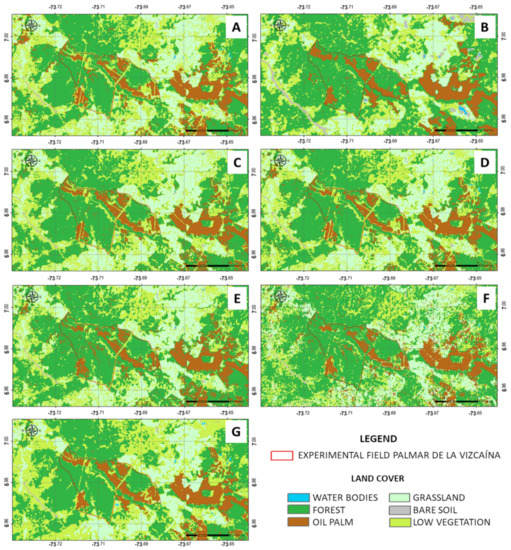 Figure 6A shows the result of the classification process using the Sentinel-2 optical image. Unlike the case analyzed above, a finer delimitation can be observed between the different land covers of the study area, such as access roads and areas of bare soils. A remarkable similarity is observed in the classification of forest cover in relation to that obtained by the SAR image. In this case, a greater area was observed in the classification of the cover associated with grassland and a reduction of low vegetation. Significant confusion can be observed in the classification of cover associated with oil palm areas with and forest areas, where the differentiation of these two coverages presented the most significant OE along with grassland cover.